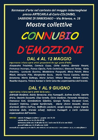 - Sono felice di ospitare presso il mio atelier ARTECARLA di Imbersago. via Brianza.n. 16, in questa seconda tappa, artisti della mia zona che presenteranno alcune loro opere in due collettive in uno splendido connubio di emozioni e di colori. Saranno esposte opere eseguite con diverse tecniche ed epsressioni pittoriche.
